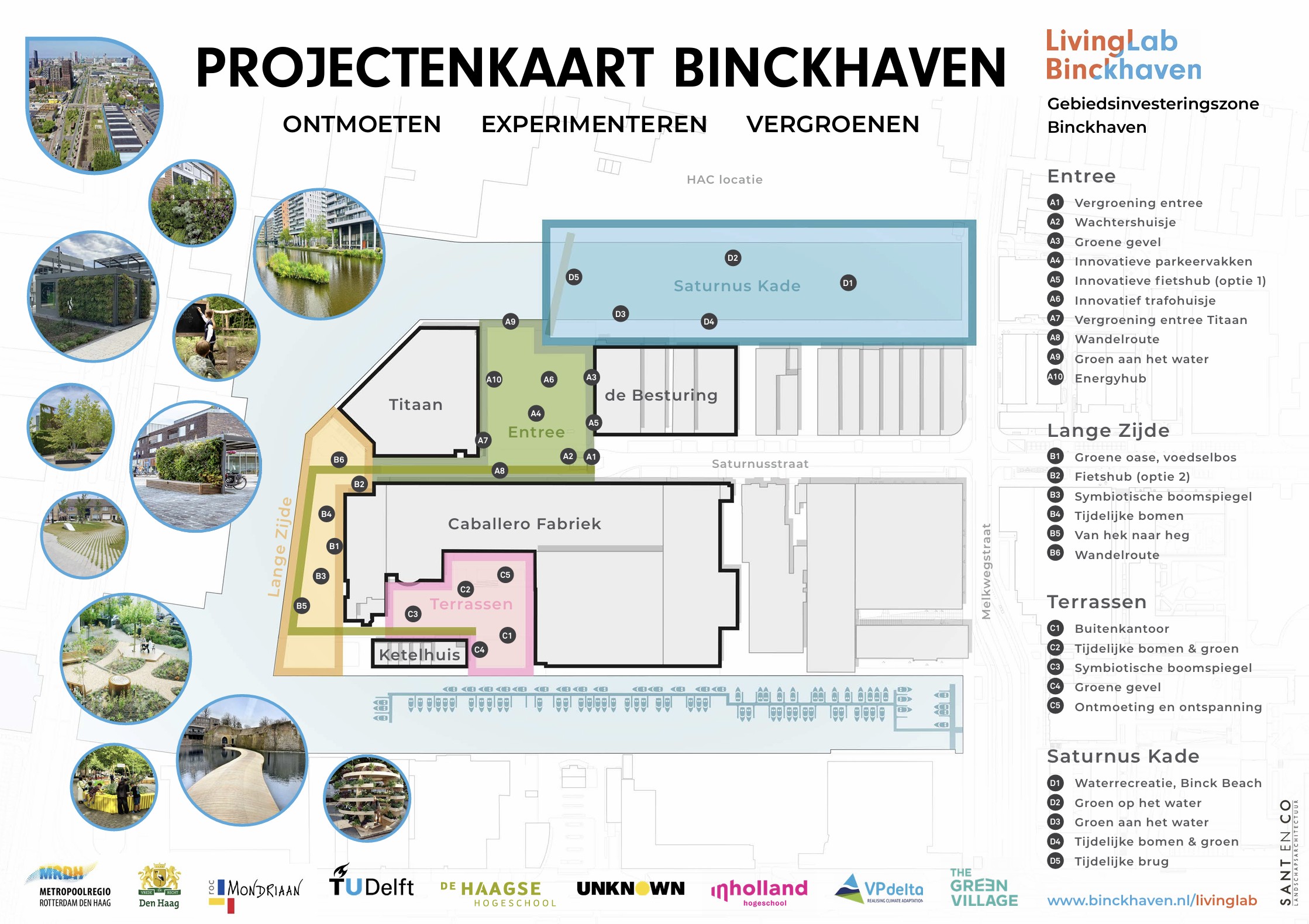 In de Binckhaven experimenteren we met innovaties in de buitenruimten samen met innovatieve startups en scale up bedrijven, (mbo/hbo) onderwijsinstellingen en gemeente Den Haag. De projectenkaart is een visuele weergave van de verschillende projecten in dit gebied, waar we komende periode gezamenlijk aan gaan werken, samen experimenteren, testen en monitoren. Meedoen? Neem contact met ons op via: livinglab@binckhaven.nl.
